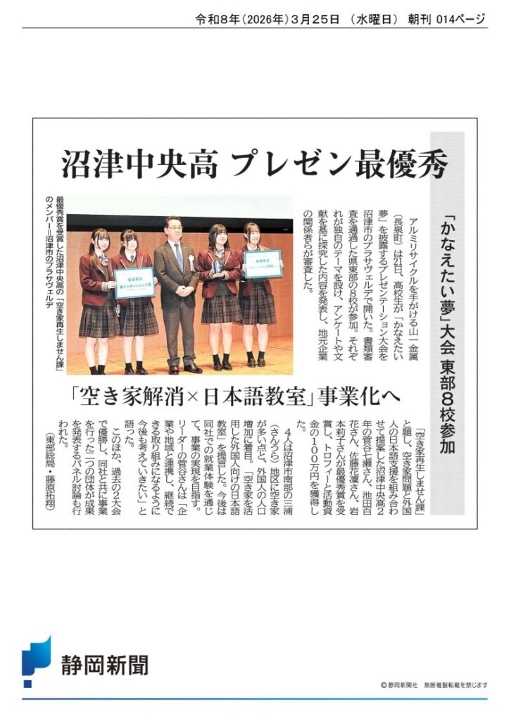 - 沼津中央高校(空き家再生しません課):空き家を活用し、外国人の孤独も防ぐ「共同支援モデル」